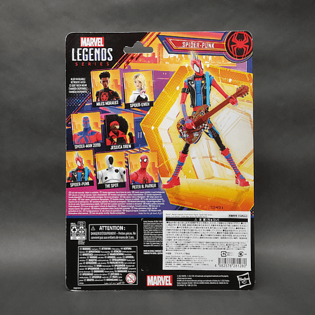 マーベルレジェンド スパイダー・パンク(アクロス・ザ・スパイダーバース)は、映画『スパイダーマン:アクロス・ザ・スパイダーバース』に登場するその他キャラクターのスパイダーマン(マイルス・モラレス)、スパイダー・グウェン、スパイダーマン2099、スパイダーマン(ピーター・B・パーカー)、スパイダーウーマン(ジェシカ・ドリュー)、スポットと共に発売されました。付属品は交換用手首1種、ギターとなります。