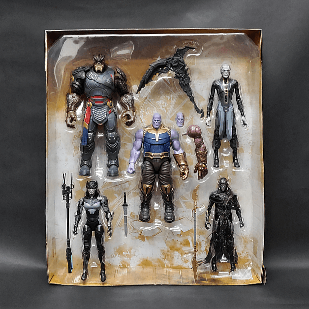 マーベルレジェンド チルドレン・オブ・サノス 5パックは海外のAmazon限定商品として発売されました。付属品はサノスが交換用頭部1種、交換用左腕1種、カル・オブシディアンが大斧、プロキシマ・ミッドナイトが槍、剣、コーヴァス・グレイヴが槍斧、エボニー・マウは付属品なしとなります。
