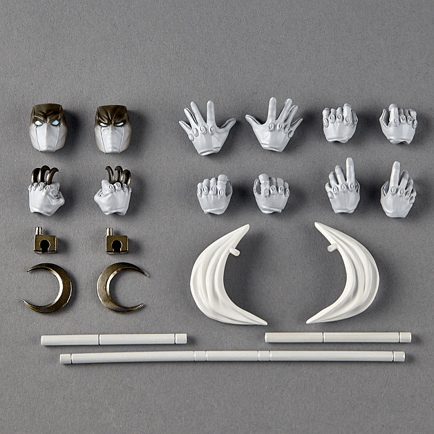 月の神コンシューの力で死の淵から蘇った傭兵マーク・スペクターは、自らを生命と復讐の化身と位置づけて悪との闘いを開始する! MARVELコミックスより、『ディズニープラス』で配信されたドラマ版でも話題の「ムーンナイト」が、アメイジング・ヤマグチに登場します!! 古代エジプトの月の神から授かった神秘的な力とともに、不安定な精神状態を抱えながらも複数の人格を使い分けるなど、独特の活躍を見せるクライムファイター。全身白のコスチュームデザインを、アメイジング・ヤマグチでは腕利きの元傭兵というプロフィールをイメージした、近代的なタクティカルアーマーとして密度の高いディテールでアレンジしました。さらに、神秘性を象徴する変幻自在のマントには、ワイヤー入りの布パーツを使用。たっぷりと大きめのマントにより、三日月のシルエットを形作ることもできます。もちろん、本体の可動は山口勝久が研鑽を重ねたギミックを搭載。胴体の両サイドを分割した肩の前後可動や、ボールジョイントとモノシャフトの組み合わせによる股関節、コミック的な人体のしなりを表現する脛可動など、幅広い可動範囲と表現力を両立しています。