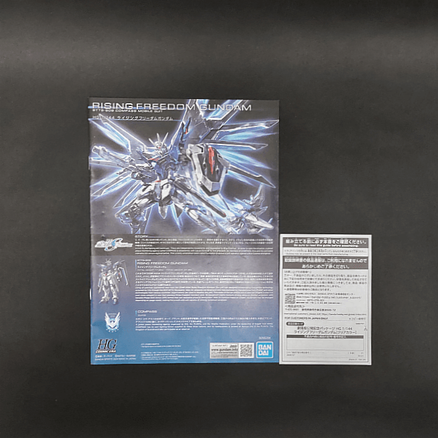 HG 1/144 ライジングフリーダムガンダム[クリアカラー]は、映画『機動戦士ガンダムSEED FREEDOM』の公開劇場で発売された後、プレミアムバンダイ限定で2024年5月(二次受注は2024年7月、三次受注は2024年9月)に発売されました。中身は各ランナーとシール×1、組立説明書×1となり、組み立てることによって本体以外にビームライフル×1、ビームサーベル×2、シールド×1、ビームシールド×1、エフェクトパーツ×1式、ハンドパーツ×1式、ジョイントパーツ×1が完成します。