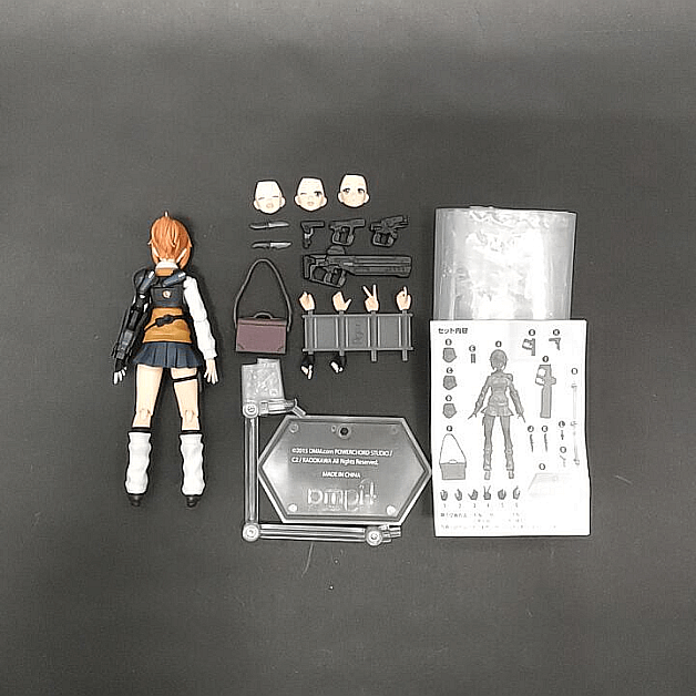 figma エグゾアーム・ジョシコウセイは2019年10月にGOODSMILE ONLINE SHOPと店頭一般流通で販売されました。付属品は交換用手首左2種右4種、交換用表情パーツ4種、高火力ハンドガンEKS-8M、コンバージョンユニット付きEKS-8M、スタンナイフ×2、スマホ、スクールバッグ、予備ジョイントパーツ、収納袋、台座一式、キャラクター紹介カードとなります。