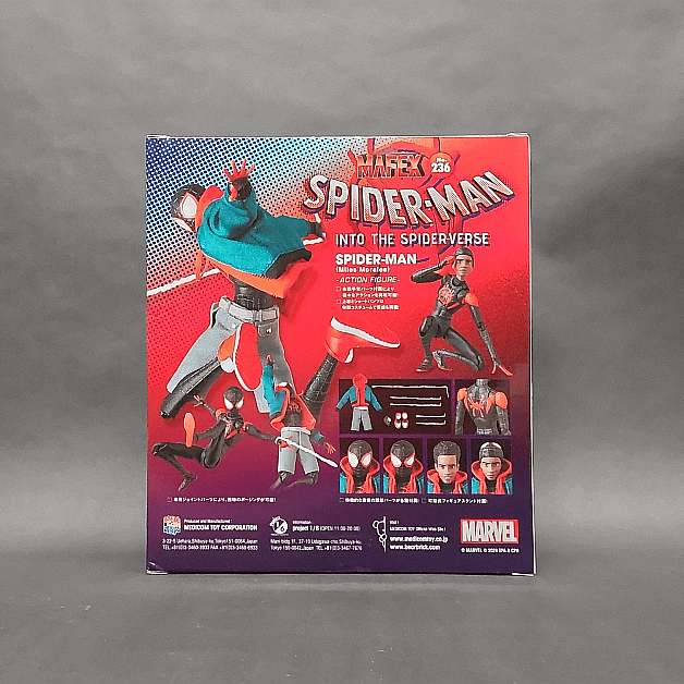 マフェックス No.236 MAFEX SPIDER-MAN(Miles Morales) RENEWAL Ver.は2024年8月に発売されました。付属品は交換用手首左右各7種、、交換用足首左右各3種、交換用頭部3種、マスク1種、ウェブパーツ×5、専用台座一式となります。