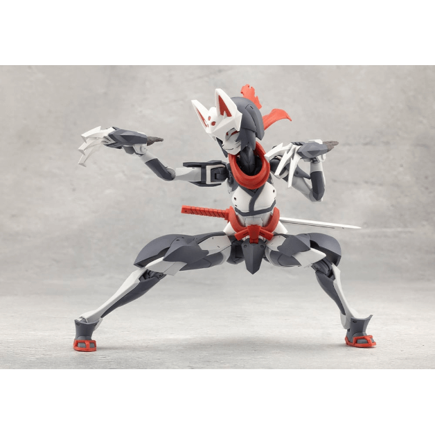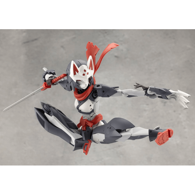 マスクは特徴的な「狐面」となっているほか、ケモミミ付きヘッドギア、外連味の溢れるマフラーは基部のボールジョイントで表情付けが可能。マフラーは取り外した状態にすることもできます。