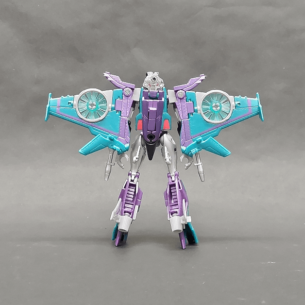 スリップストリームは『トランスフォーマー アニメイテッド』で登場したスタースクリームのクローンの一人。パープルとエメラルドグリーンを基調とした毒々しくも鮮やかなカラーリングが、悪の女性キャラクターらしい印象を与えています。トランスフォーマー レジェンズ LG16 スリップストリームは、同シリーズのLG12 ウインドブレードの一部金型を新規造形に変更したリデコアイテムで、頭部・胸部・武器などが新たに作り起こされています。変形機構はLG12と共通なので、同様にVTOL(垂直離着陸機)戦闘機に変形し、ローター部分も変わらず可動します。先に発売された同型のLG12 ウインドブレードも同様なのですが、ロボットモード時にヒールのようになる変形は女性型トランスフォーマーらしくて良い一方、固定が甘く、やや動きやすいため、ポージング中にズレてしまうのが惜しいところです。