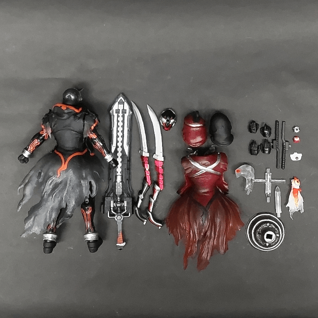 そんなS.I.C. 仮面ライダーゴースト オレ魂の原型を手掛けたのは、S.I.C.を長年支えてきた安藤賢司氏。ホラーや西洋ゴシック、和風、さらにはヒップホップカルチャーのエッセンスまで融合されたデザインは、S.I.C.シリーズの中でもとりわけ個性的な仕上がりです。マスクや胸部アーマーは多層構造になっており、クリア素材を用いることでゴーストらしく透ける質感と内部構造を表現。まるで実体を持たない霊体がそこに存在しているかのような、不気味さと神秘性を感じさせます。裾の長いジャケットは風に揺らめくような造形となっており、静止状態でもどこか動きがあるかのような印象を与えるのも特徴です。さらに、パーツを差し替えることで武士の魂を宿した「ムサシ魂」へ換装が可能。破れた着物風の意匠や、ガンガンセイバーの三分割された刀身を用いた二刀流のスタイルは剣豪の風格を漂わせます。