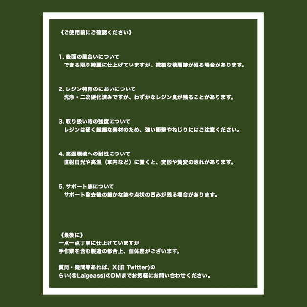 2. レジン特有のにおいについて 洗浄・二次硬化済みですが、わずかなレジン臭が残ることがあります。