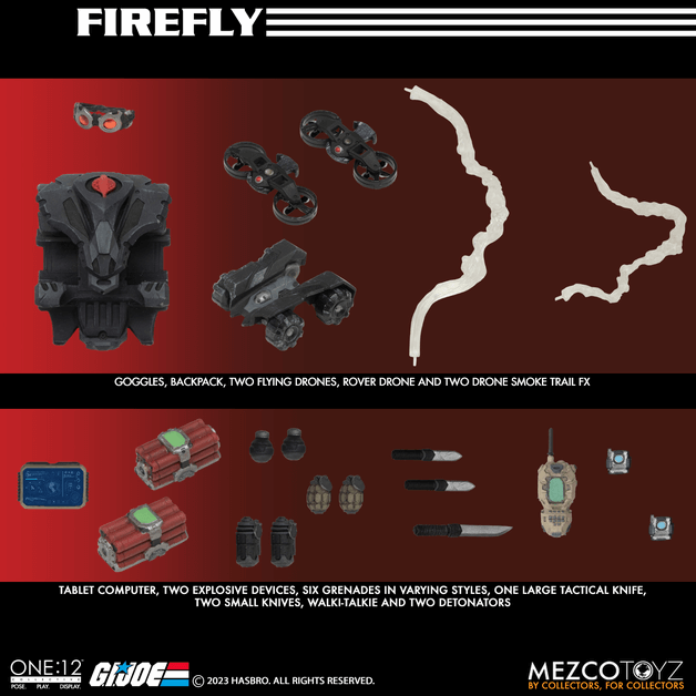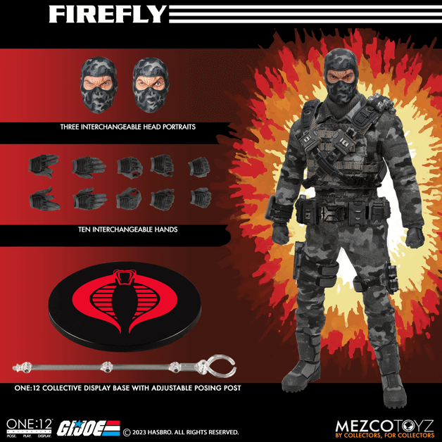 1/12スケールというサイズ感にも関わらず、素材に布を使ったコスチュームなど様々な技術を盛り込み、「アクションフィギュア」にさらなる進化をもたらした「ワン12コレクティブ」。今やメズコトイズを代表するこのシリーズ、『G.I.JOE』から「COBRA」側の破壊工作員ファイアフライがラインナップです!