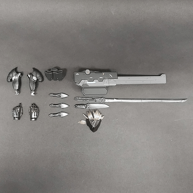 プレイアーツ改 METAL GEAR RISING 雷電は2013年2月に店頭で一般発売されました。付属品はフェイスマスクパーツ、交換用手首×2、交換用足首×2、高周波ブレード、鞘、ナイフ、クナイ×3、クナイシース、専用台座一式となります。(こちらの商品は専用台座一式欠品しておりますが別売りの市販台座が付属)