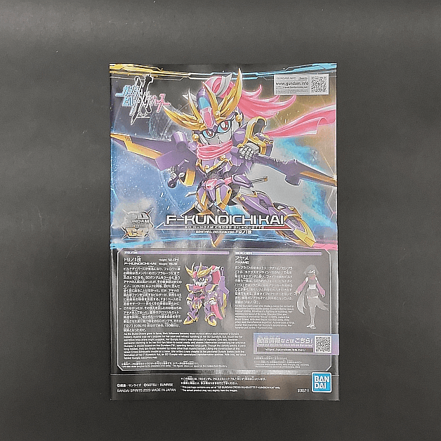 SDガンダム クロスシルエット F9ノ1改は2023年11月11日に店頭一般流通で発売されました。中身は各ランナーとシール×1、組立説明書×1となり、組み立てることによって本体以外にクナイ×2、忍者刀×1、エフェクトパーツ1式、ジョイントパーツ1式が完成します。