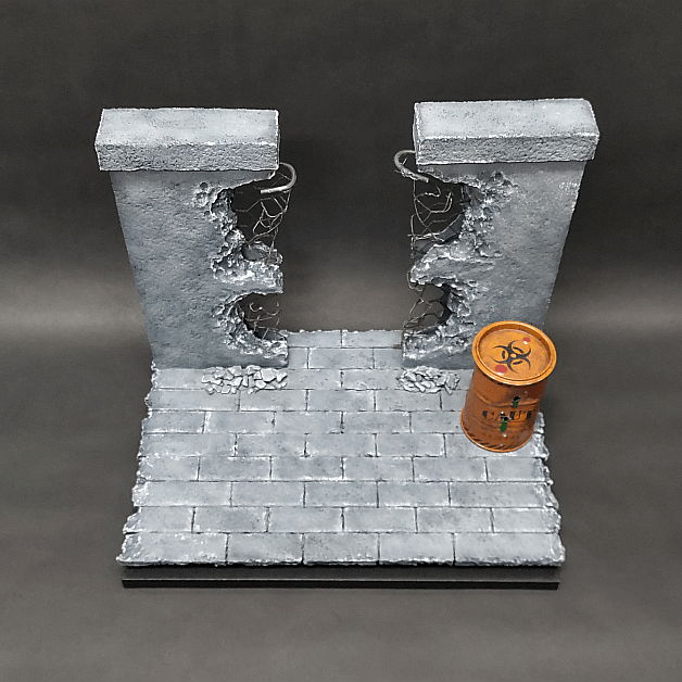 エアブラシ塗装でこだわりの仕上げを施しました。壁はマグネットで分解可能で、持ち運びも簡単!さらに、ウェザリングしたドラム缶と台座も付属しています。写真を撮られる際に前面、背面どちらもお使いいただけるように工夫して作らせていただきました。