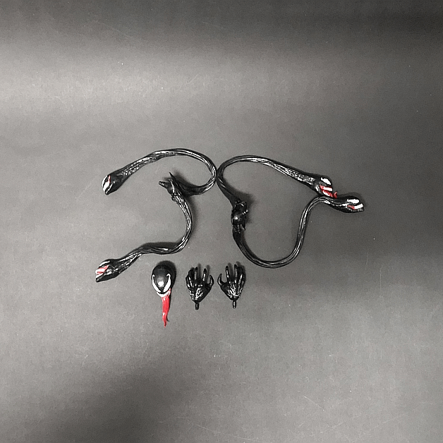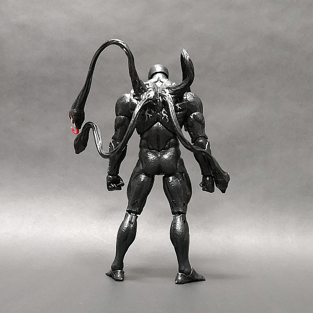 マーベルレジェンドシリーズにおいて実写版ヴェノムは以前にも映画『ヴェノム』(原題:Venom)版のものがヴェノムプールシリーズから発売されていますが、新たに映画『ヴェノム:レット・ゼア・ビー・カーネイジ(原題:Venom: Let There Be Carnage)』版が新たに単品パッケージとなって発売されました。ヴェノムプールシリーズ版との違いですが、目立つところとしてはヴェノム:レット・ゼア・ビー・カーネイジ版は背中にシンビオートエフェクトパーツを取り付けることが可能で、そのための穴が背部に空いている点が挙げられます。また、塗装面もかなり変わっており、胸、肩などの血管の模様の塗装が細かくなっていたり、口腔内と舌の色が鮮やかな赤になっていたり、目が重塗装に仕上げられているといった違いがあります。