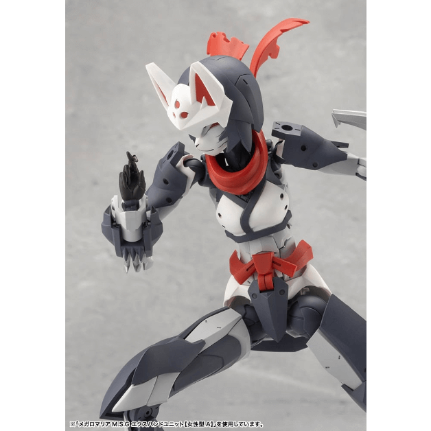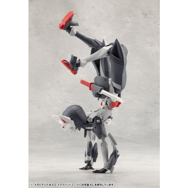 別売りのメガロマリア M.S.G エクスハンドユニット【女性型A】を使用することでポージングの幅が大きく広がります。開き手を使うと逆立ち姿勢でも自立させることが可能です。