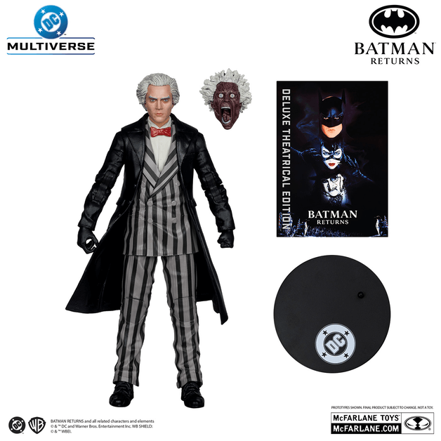 バットマンは、グラップネル・ガン、バットラング、差し替え用ハンドパーツが付属。キャットウーマンは、鞭、テーザーガンが付属。マックス・シュレックは、焼け焦げた顔の差し替え用ヘッドが付属。ペンギンは、着脱できるコートと帽子、傘が付属。ペンギン軍団は、武装した大きさの異なるペンギンが3体セットとなっており、別パッケージのペンギンが使用できるジャケットが付いてくる。また、ピースメイカーは、素顔の差し替え用ヘッド、2種類の差し替え用ヘルメット、ピストル、ワッシーが付属する。