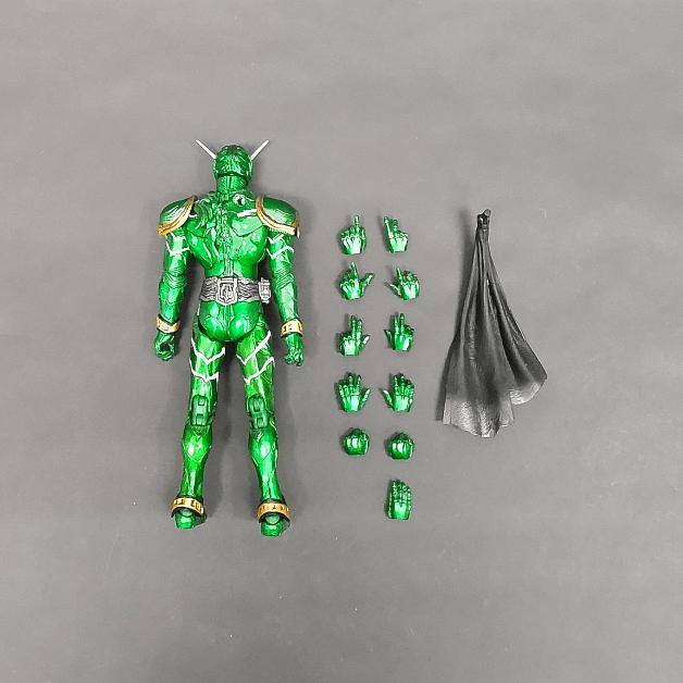 メタリックグリーンの塗装が非常に鮮やかな、S.I.C. 仮面ライダーサイクロンは安藤賢司氏による独自のアレンジで立体化されました。仮面ライダーサイクロンの象徴である「ウィンディスタビライザー(マフラー)」は風になびくラインで造形されており、ポージングに躍動感を与えます。ロストドライバーのギミックも再現されており、サイクロンメモリの装填も可能ですが、ガイアメモリは非常に小さいため紛失にはご注意ください。また、小説『仮面ライダーW ~Zを継ぐ者~』で見せたマキシマムドライブ、風をまとった手刀を再現するための手首とエフェクトが付属しています。(こちらの商品はエフェクトパーツ欠品)
