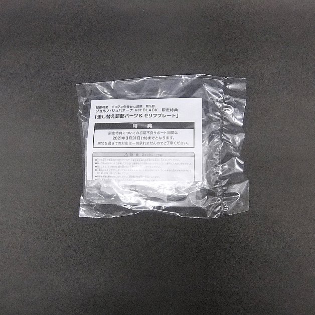 超像可動 ジョルノ・ジョバァーナ Ver.BLACKは、2020年12月にMEDICOS ONLINE SHOP限定の特典付き版として超像可動 リゾット・ネエロとともに先行販売されました。発売日は今のところ未定ですが、後日特典なし版が一般販売予定となっています。こちらの限定特典版にはジョルノの差し替え頭部パーツとセリフプレート「覚悟とは!!暗闇の荒野に!!進むべき道を切り開く事だッ!」が付属します。共通の付属品は交換用手首右4種左2種、交換用頭部1種、ブローチ、ライター、パン、ティーカップ、台座一式です。これまで超像可動シリーズのジョルノは、原作者荒木飛呂彦指定カラー(ファーストカラー)、セカンドカラー、WF限定版と発売されており、Ver.BLACKはジョルノ4体目の超像可動となっています。こちらのブラックカラーはTVアニメシリーズ最終回のエピローグにて、ボスを倒し、ギャング・スターとなったジョルノが登場した際に着ていた服の色となっています。また、2021年5月にMEDICOS ONLINE SHOP限定の特典付きで先行販売される超像可動 グイード・ミスタ&セックス・ピストルズ・サードは、ジョルノと同じく最終回の場面に登場しているので一緒に飾るのがお勧めです。