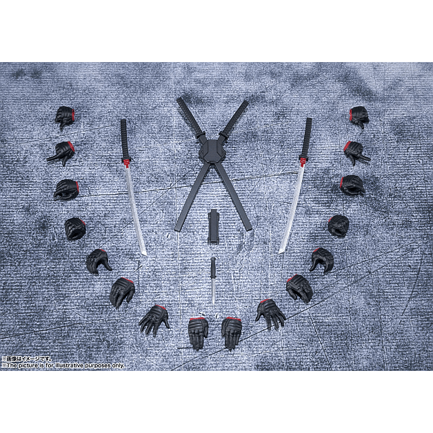付属武器パーツで幅広いポージングが可能。背中に装着できる「刀(収納状態)」は柄の部分が取り外し可能で、鞘としても使用できる。手首パーツで、指差しポーズも再現できる。広い可動域で、リラックスしたポージングも可能。眼を変更することで表情の変更が可能。眼と手首を組み合わせて、さまざまな「デッドプール」を作り出すことができる。